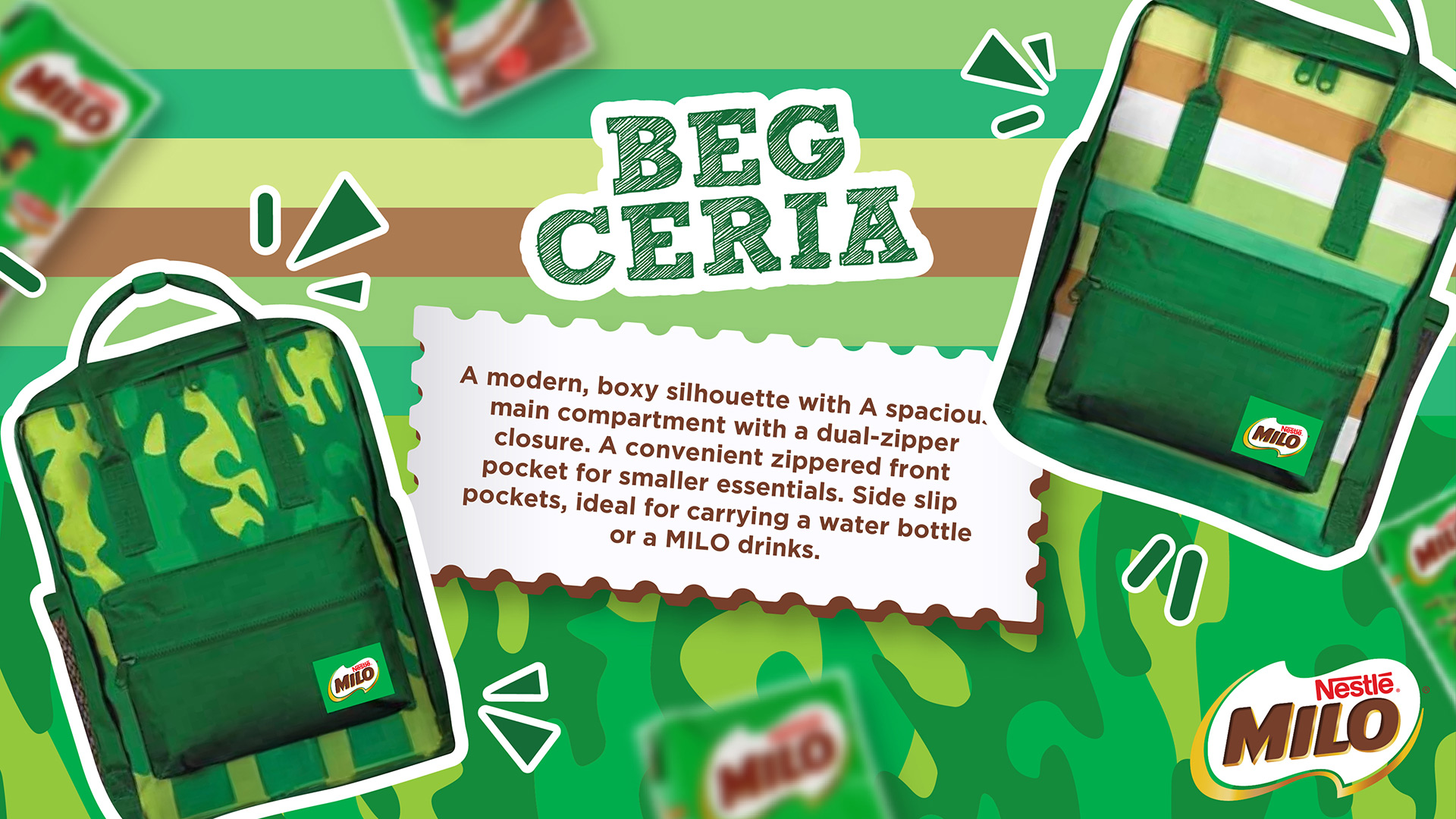 A modern, boxy silhouette with A spaciou. main compartment with a dual-zipper closure. A convenient zippered front pocket for smaller essentials. Side slip pockets, ideal for carrying a water bottle or a MILO drinks.